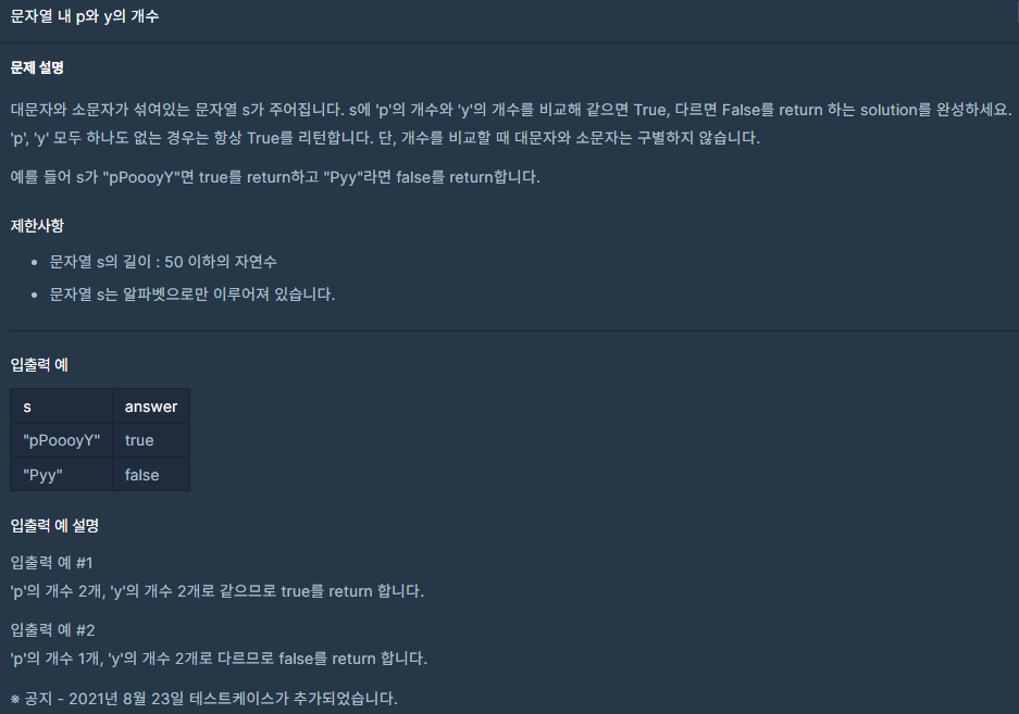- ๋ฌธ์์ด์ ๊ฒ์ฌํด p์ y๋ฅผ ๋์๋ฌธ์ ๊ตฌ๋ถ ์์ด ์ธ๋ ๋ฌธ์ ์ด๋ค.