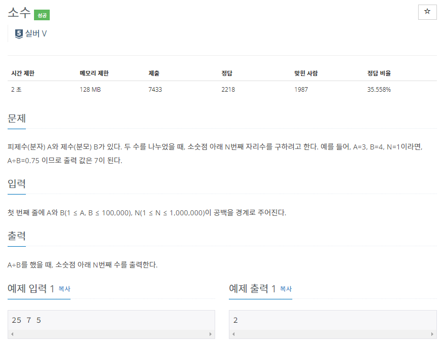 ํผ์ ์(๋ถ์) A์ ์ ์(๋ถ๋ชจ) B๊ฐ ์๋ค. ๋ ์๋ฅผ ๋๋์์ ๋, ์์ซ์ ์๋ N๋ฒ์งธ ์๋ฆฌ์๋ฅผ ๊ตฌํ๋ ค๊ณ ํ๋ค. ์๋ฅผ ๋ค์ด, A=3, B=4, N=1์ด๋ผ๋ฉด, A÷B=0.75 ์ด๋ฏ๋ก ์ถ๋ ฅ ๊ฐ์ 7์ด ๋๋ค.