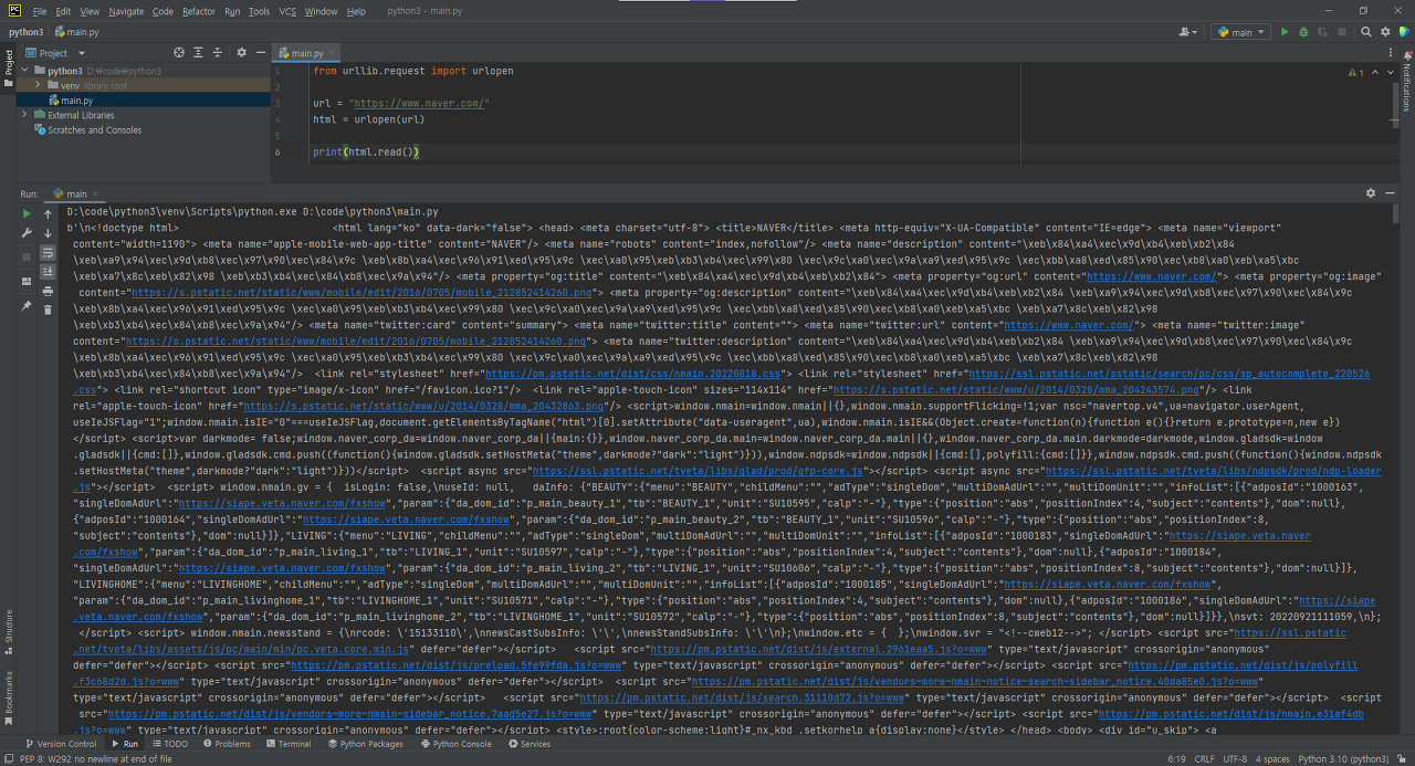 - urllib는 파이썬에서 인터넷에서 데이터를 받아 오는 기능들이 들어 있는 패키지