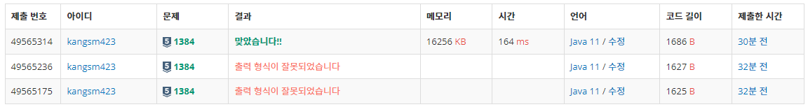 - ์ถ๋ ฅ ํ์์ ๊ทธ๋ฅ ๊ทธ๋ฃน๋ง๋ค ๊ณต๋ฐฑ๋ง ์์ผ๋ฉด ๋ ์ค ์์๋๋ฐ ์ ํํ ๋ง์ถฐ์ผํด์ ๋ช ๋ฒ ํ๋ ธ๋ค.