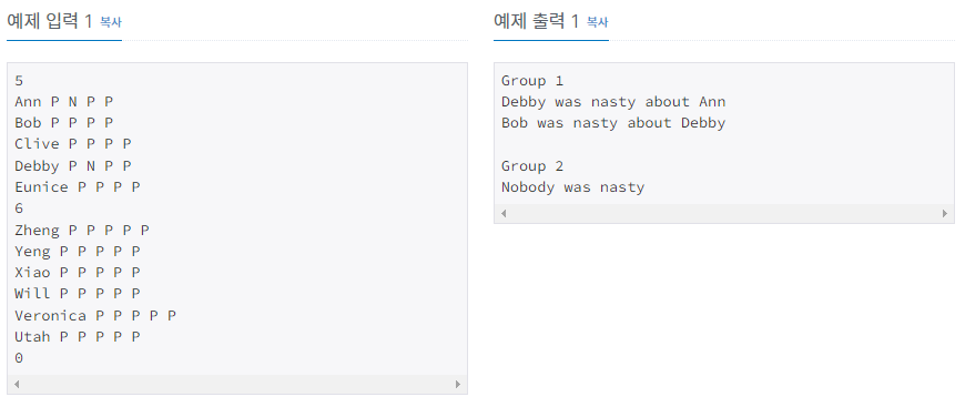 ๊ทธ๋ฃน ๋ฒํธ๋ฅผ "Group 1"๊ณผ ๊ฐ์ด ์ถ๋ ฅํจ์ผ๋ก์จ ์ถ๋ ฅ์ ์์ํฉ๋๋ค. ๊ทธ ๋ค์ ์ค๋ถํฐ ๋๊ฐ(A) ๋๊ตฌ(B)์๊ฒ ๋์ ๋ง์ ํ๋์ง "A was nasty about B"๋ก ํ ์ค์ฉ ์ถ๋ ฅํฉ๋๋ค. ๋์ ๋ง์ด ์ฌ๋ฌ ๊ฐ๋ผ๋ฉด, ์ ๋ ฅ๋ฐ์ ์