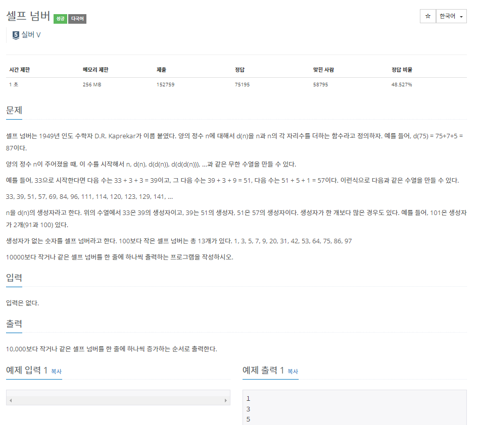 ์ ํ ๋๋ฒ๋ 1949๋ ์ธ๋ ์ํ์ D.R. Kaprekar๊ฐ ์ด๋ฆ ๋ถ์๋ค. ์์ ์ ์ n์ ๋ํด์ d(n)์ n๊ณผ n์ ๊ฐ ์๋ฆฌ์๋ฅผ ๋ํ๋ ํจ์๋ผ๊ณ ์ ์ํ์. ์๋ฅผ ๋ค์ด, d(75) = 75+7+5 = 87์ด๋ค. ์์ ์ ์ n์ด ์ฃผ์ด์ก์ ๋,