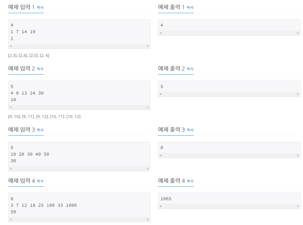 - l๊ฐ์ ๋ฐฐ์ด S์ ์์๋ฅผ ํฌํจํ์ง ์๊ณ , n์ ํฌํจํ๋ ๋ฒ์( [a,b] )์ ๊ฒฝ์ฐ์ ์๋ฅผ ์ถ๋ ฅํ๋ค.