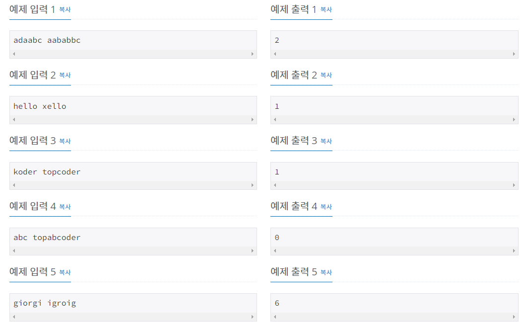 ๊ธธ์ด๊ฐ N์ผ๋ก ๊ฐ์ ๋ฌธ์์ด X์ Y๊ฐ ์์ ๋, ๋ ๋ฌธ์์ด X์ Y์ ์ฐจ์ด๋ X[i] ≠ Y[i]์ธ i์ ๊ฐ์์ด๋ค. ์๋ฅผ ๋ค์ด, X=”jimin”, Y=”minji”์ด๋ฉด, ๋์ ์ฐจ์ด๋ 4์ด๋ค. ๋ ๋ฌธ์์ด A์ B๊ฐ ์ฃผ์ด์ง๋ค. ์ด๋, A์