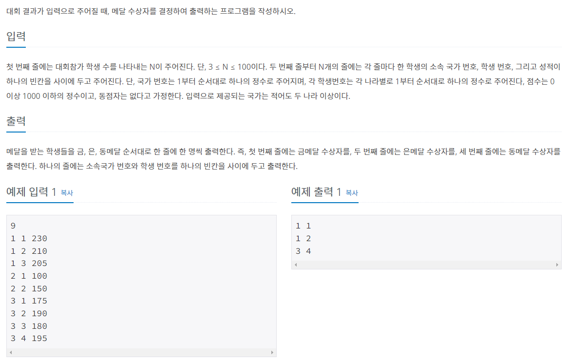 ์ฒซ ๋ฒ์งธ ์ค์๋ ๋ํ์ฐธ๊ฐ ํ์ ์๋ฅผ ๋ํ๋ด๋ N์ด ์ฃผ์ด์ง๋ค. ๋จ, 3 ≤ N ≤ 100์ด๋ค. ๋ ๋ฒ์งธ ์ค๋ถํฐ N๊ฐ์ ์ค์๋ ๊ฐ ์ค๋ง๋ค ํ ํ์์ ์์ ๊ตญ๊ฐ ๋ฒํธ, ํ์ ๋ฒํธ, ๊ทธ๋ฆฌ๊ณ ์ฑ์ ์ด ํ๋์ ๋น์นธ์ ์ฌ
