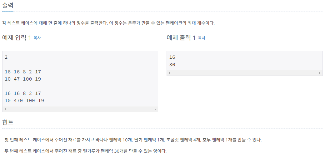 ์ฒซ ๋ฒ์งธ ํ ์คํธ ์ผ์ด์ค์์ ์ฃผ์ด์ง ์ฌ๋ฃ๋ฅผ ๊ฐ์ง๊ณ ๋ฐ๋๋ ํฌ์ผ์ต 10๊ฐ, ๋ธ๊ธฐ ํฌ์ผ์ต 1๊ฐ, ์ด์ฝ๋ฆฟ ํฌ์ผ์ต 4๊ฐ, ํธ๋ ํฌ์ผ์ต 1๊ฐ๋ฅผ ๋ง๋ค ์ ์๋ค. ๋ ๋ฒ์งธ ํ ์คํธ ์ผ์ด์ค์์ ์ฃผ์ด์ง ์ฌ๋ฃ ์ค ๋ฐ