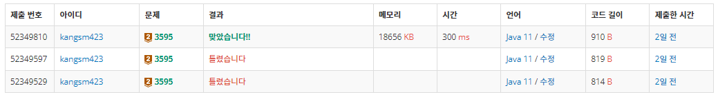 - ๊ฒ๋์ด์ ํฌ๊ธฐ๋ฅผ long์ผ๋ก ๋ด์์ผํ๋ ๊ฑด ์์ํ์ง๋ง, ์กฐ๊ฑด๋ฌธ ์์ ๋ฐ๋ก ๋ฃ์ด์ int๋ก ๊ณ์ฐ๋์ ํ๋ ธ์๋ค.