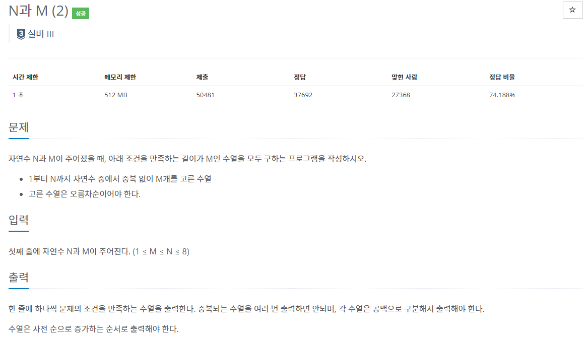 - 1๋ถํฐ n๊น์ง์ ์ ์ค์ m๊ฐ๋ฅผ ๊ณ ๋ฅด๋ ๊ฒฝ์ฐ์ ์๋ฅผ ์ค๋ฆ์ฐจ์์ผ๋ก ์ถ๋ ฅํ๋ ๋ฌธ์ ์ด๋ค.