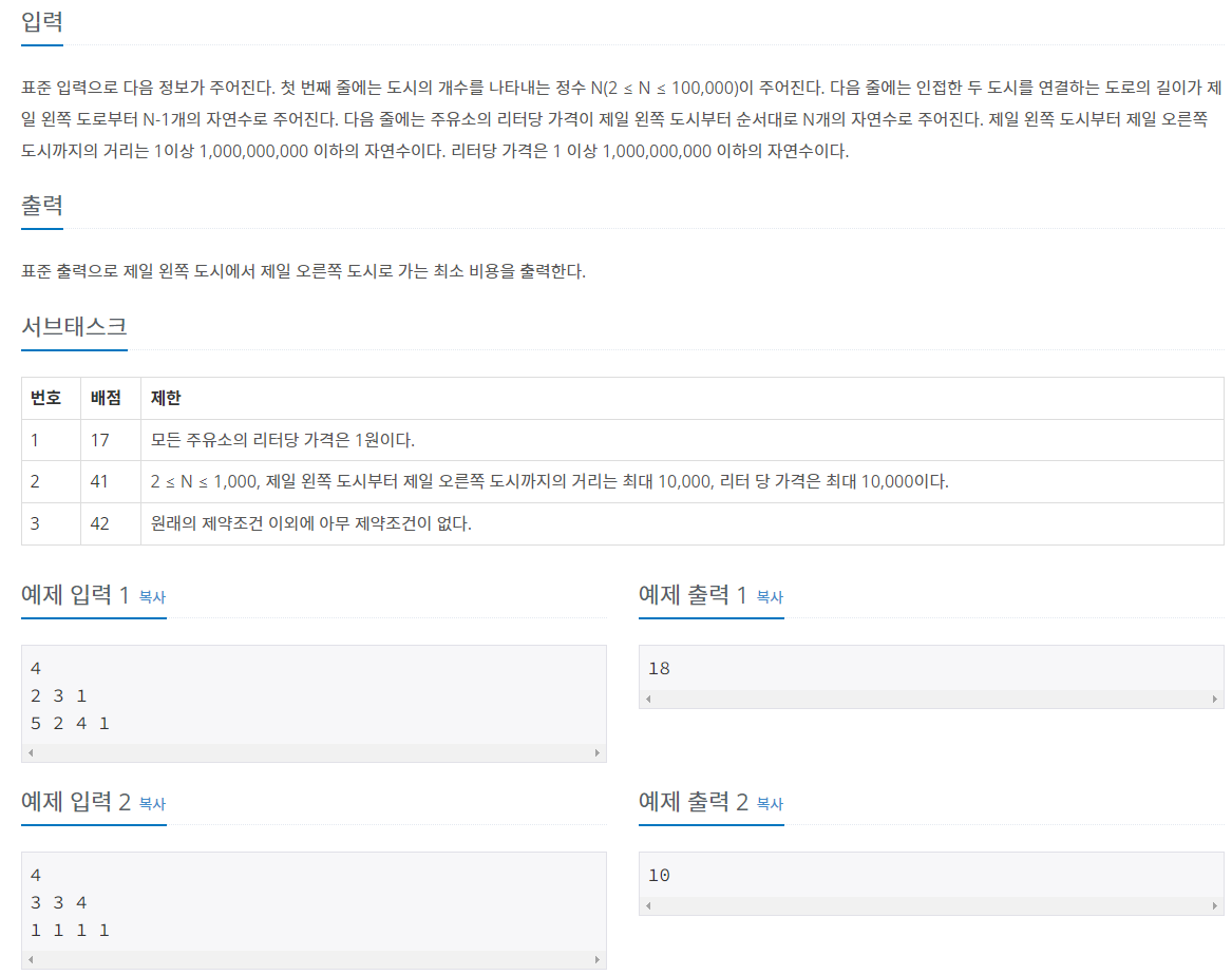 - n-1๊ฐ์ ๋๋ก ๊ธธ์ด์ n๊ฐ์ ๋์ ๋ณ ๊ธฐ๋ฆ๊ฐ์ ์ ๋ ฅ๋ฐ๋๋ค.