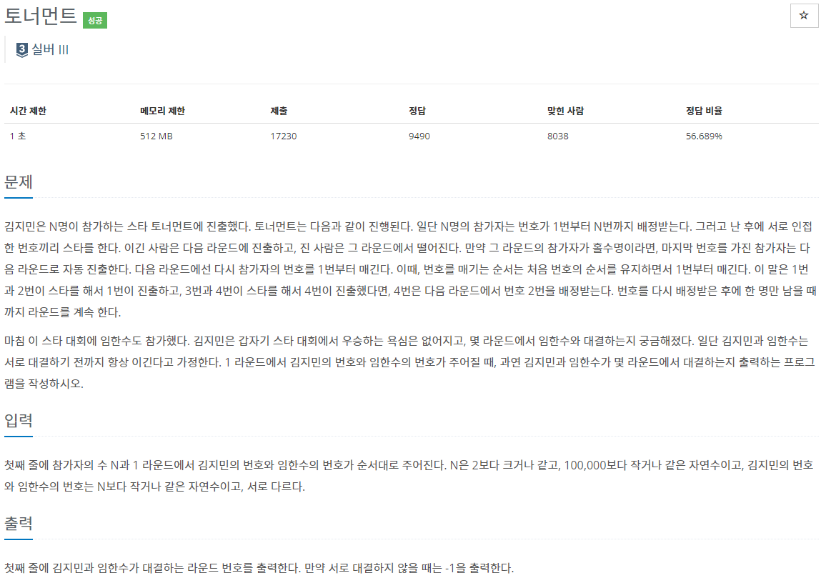 BOJ_1057 : ํ ๋๋จผํธ ๋ณธ๋ฌธ