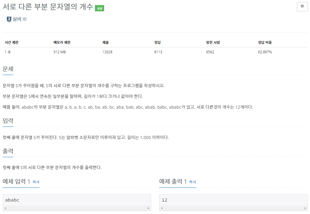 11478๋ฒ: ์๋ก ๋ค๋ฅธ ๋ถ๋ถ ๋ฌธ์์ด์ ๊ฐ์