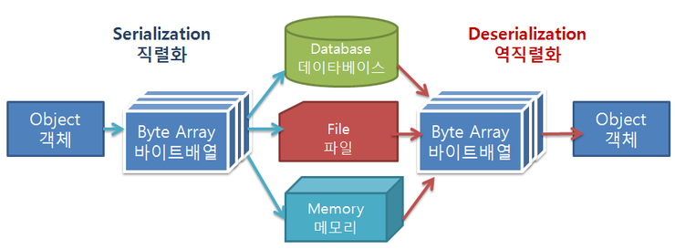 - ์๋ฐ ์์คํ ๋ด๋ถ์์ ์ฌ์ฉ๋๋ ๊ฐ์ฒด๋ฅผ ์ธ๋ถ์ ์๋ฐ ์์คํ ์์๋ ์ฌ์ฉํ ์ ์๋๋ก ๋ฐ์ดํธํํ๋ก ๋ณํํ๋ ๊ธฐ์ ๊ณผ ๋ฐ์ดํธ๋ก ๋ณํ๋ ๋ฐ์ดํฐ๋ฅผ ๋ค์ ๊ฐ์ฒด๋ก ๋ณํํ๋ ๊ธฐ์ ์ ์์ธ๋ฌ์ ์ง๋ ฌํ๋ก ํํ