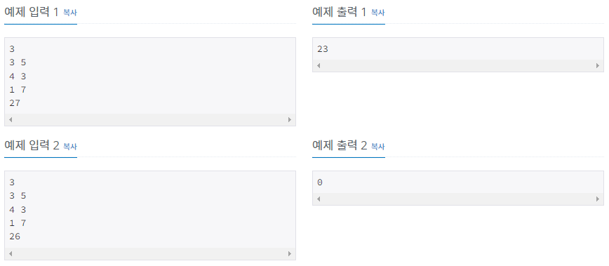 - ๋๊น์ง ํ์ํด๋ ๊ฐ์ ์์ ๊ฐ์ค๊ฐ ๋ฐ์ํ๋ ๊ฒฝ์ฐ๊ฐ ์์ผ๋ฉด 0์ ์ถ๋ ฅํ๋ค.