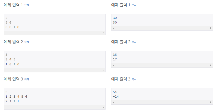 ์ฒซ์งธ ์ค์ ์์ ๊ฐ์ N(2 ≤ N ≤ 11)๊ฐ ์ฃผ์ด์ง๋ค. ๋์งธ ์ค์๋ A1, A2, ..., AN์ด ์ฃผ์ด์ง๋ค. (1 ≤ Ai ≤ 100) ์ ์งธ ์ค์๋ ํฉ์ด N-1์ธ 4๊ฐ์ ์ ์๊ฐ ์ฃผ์ด์ง๋๋ฐ, ์ฐจ๋ก๋๋ก ๋ง์ (+)์ ๊ฐ์, ๋บ์ (-)์ ๊ฐ์,