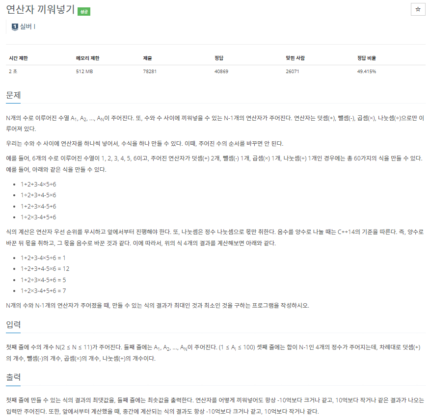 BOJ_14888 : ์ฐ์ฐ์ ๋ผ์๋ฃ๊ธฐ ๋ณธ๋ฌธ