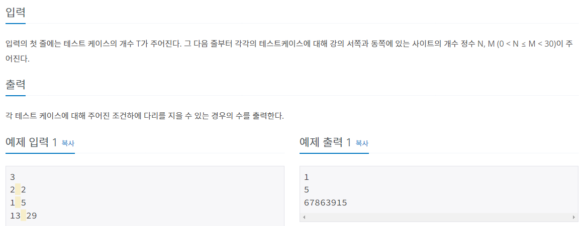 BOJ_1010 : ๋ค๋ฆฌ ๋๊ธฐ ๋ณธ๋ฌธ