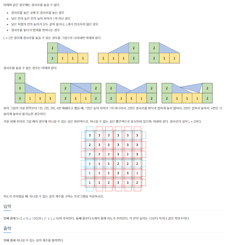 - N x N ์ง๋์์ ์ง๋๊ฐ ์ ์๋ ๊ธธ์ด ๋ช ๊ฐ์ธ์ง ์ถ๋ ฅํ๋ค.