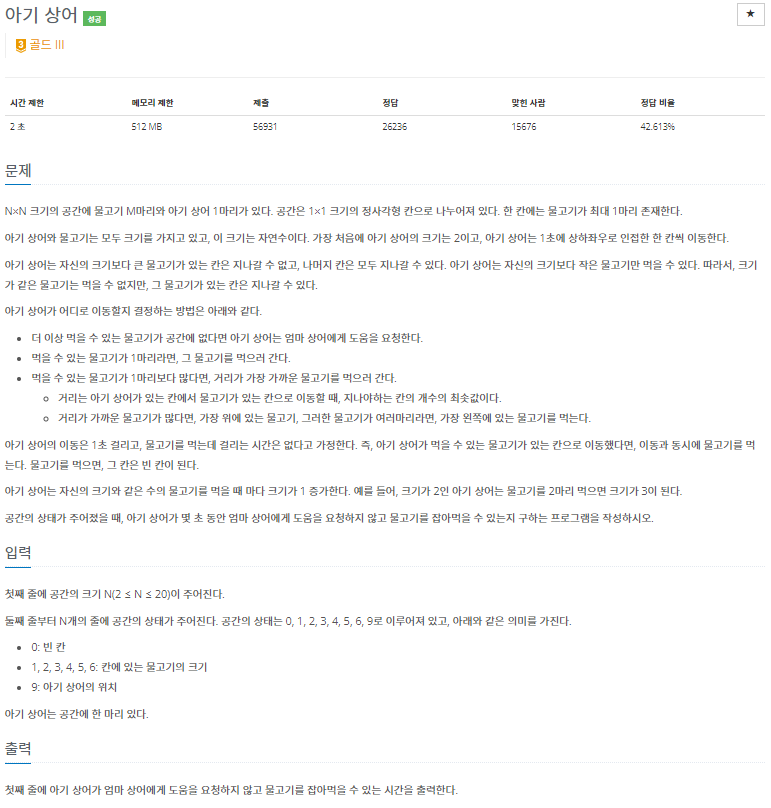- N x N 공간에 물고기 M마리와 아기 상어 1마리가 있다.