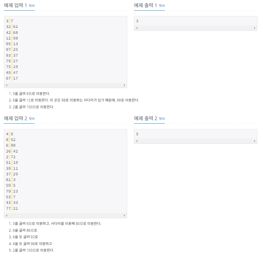 ์ฒซ์งธ ์ค์ ๊ฒ์ํ์ ์๋ ์ฌ๋ค๋ฆฌ์ ์ N(1 ≤ N ≤ 15)๊ณผ ๋ฑ์ ์ M(1 ≤ M ≤ 15)์ด ์ฃผ์ด์ง๋ค. ๋์งธ ์ค๋ถํฐ N๊ฐ์ ์ค์๋ ์ฌ๋ค๋ฆฌ์ ์ ๋ณด๋ฅผ ์๋ฏธํ๋ x, y (x < y)๊ฐ ์ฃผ์ด์ง๋ค. x๋ฒ ์นธ์ ๋์ฐฉํ๋ฉด, y๋ฒ ์นธ์ผ