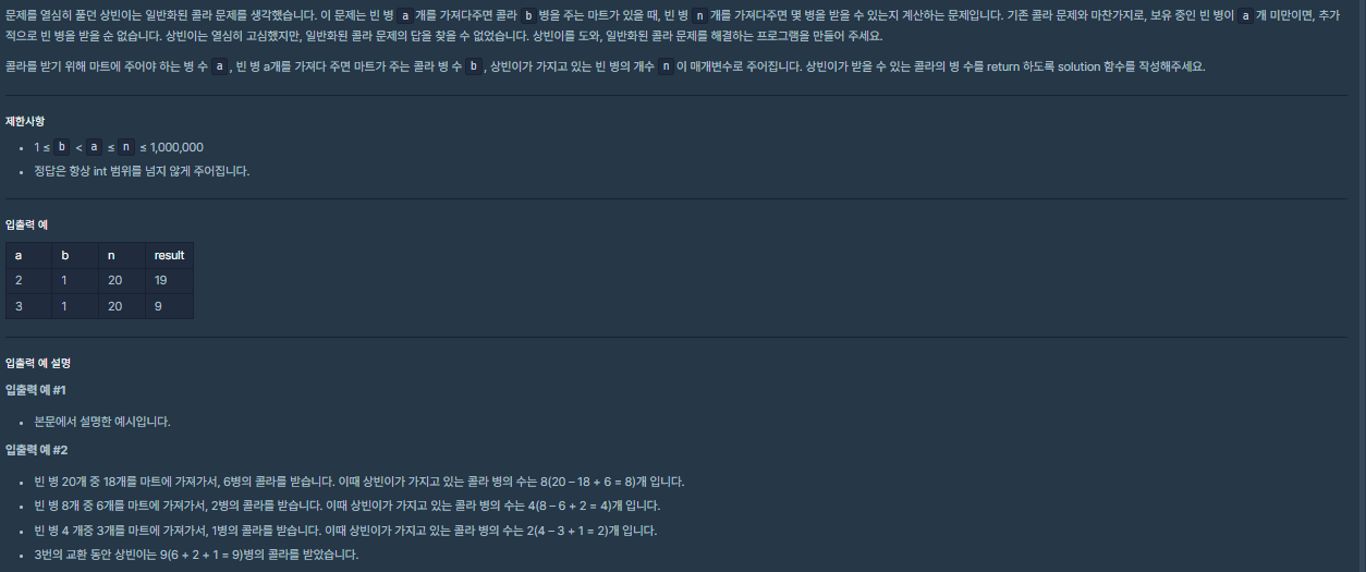 - a๊ฐ์ ์ฝ๋ผ๋ฅผ ๊ฐ์ ธ๊ฐ๋ฉด b๊ฐ๋ฅผ ์ฃผ๋ ๊ฐ๊ฒ์ n๊ฐ์ ์ฝ๋ผ๋ฅผ ๊ฐ์ ธ๊ฐ์๋ ๋ฐ์ ์ ์๋ ์ฝ๋ผ์ ์ดํฉ์ ๋ฆฌํดํ๋ค.