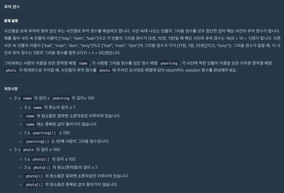 public int[] solution(String[] name, int[] yearning, String[][] photo) {