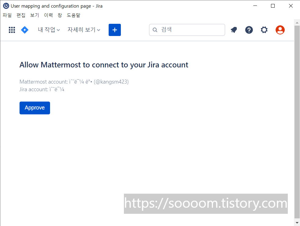 ๋ก๊ทธ์ธ ์๋ฃ ํ [Approve]๋ฅผ ๋๋ฌ Jira์์ MM ์ผ๋ก ์ฐ๊ฒฐ์ ํ์ฉํ๋ค.