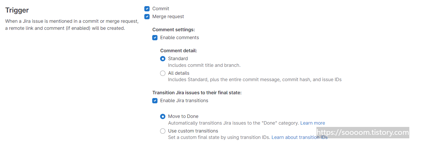 ์ปค๋ฐ ๋ฉ์์ง ์ ๋ชฉ์ '[ํ๋ก์ ํธ๋ฒํธ]-[์ด์๋ฒํธ]' ํํ๋ก ๋ฃ์ผ๋ฉด Jira์ด์์ ์ฐ๊ฒฐ๋๋ค.