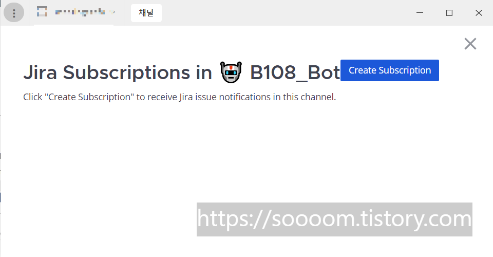 ์ฑํ ์ผ๋ก '/jira subscribe'๋ฅผ ์น๋ฉด ์์ ๊ฐ์ ์ฐฝ์ด ๋ํ๋๋ค.