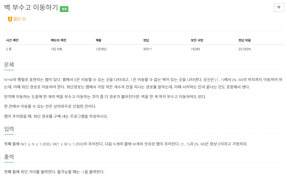 BOJ_2206 : ๋ฒฝ ๋ถ์๊ณ ์ด๋ํ๊ธฐ ๋ณธ๋ฌธ