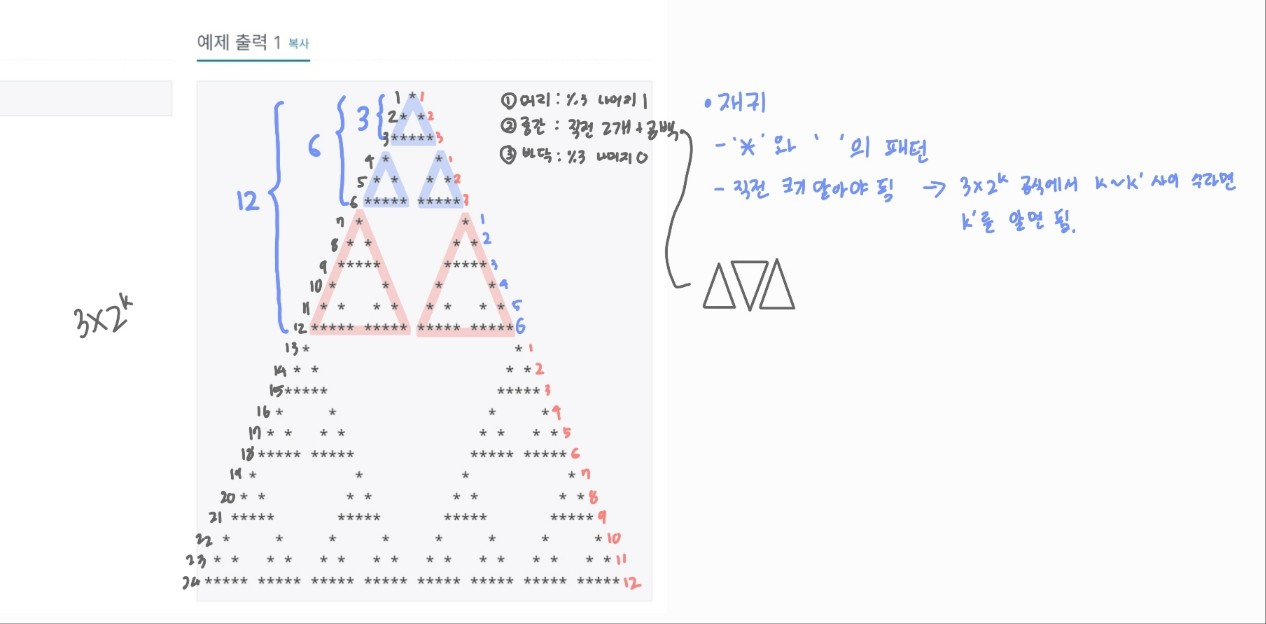 - ๋ฐ๋ผ์ ๊ฐ ์ค๋ง๋ค ์ง์ ์ผ๊ฐํ์ ๋์ด๋ฅผ ์์์ผํ๋๋ฐ, ์ด๋ 3*2^k ~ 3*2^k' ๋ฒ์์ ์ํ์ง ์ฐพ๊ณ , 3*2^k๋ฅผ ๊ตฌํ๋ฉด ๋๋ค.