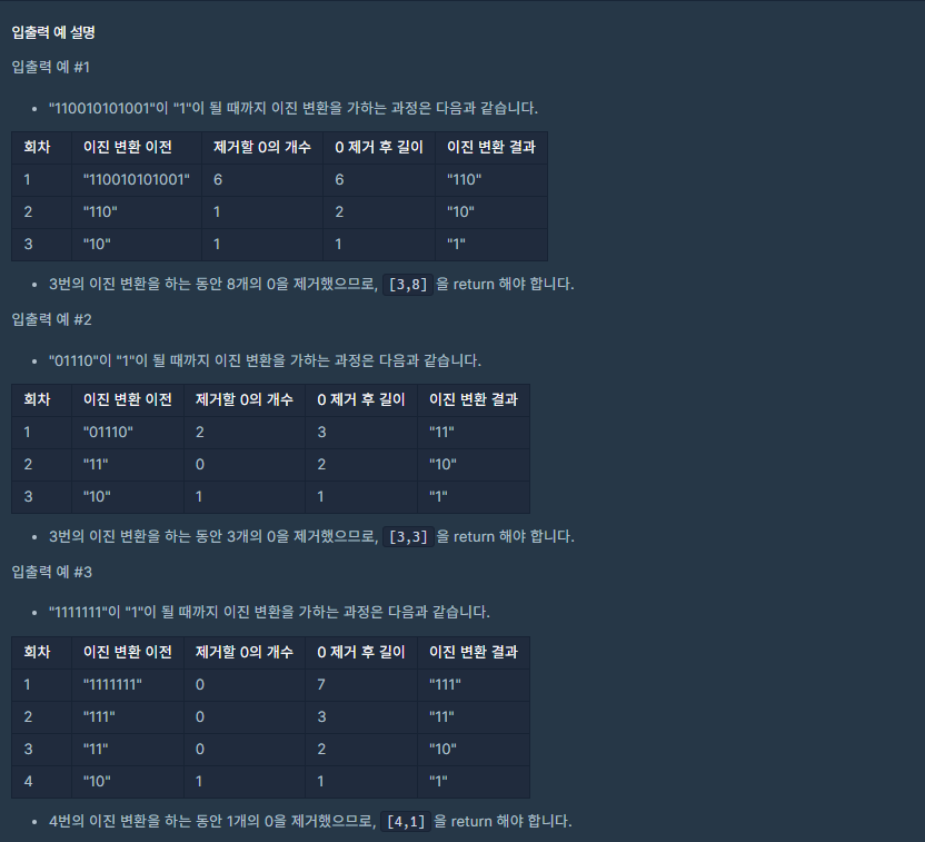 - 0๊ณผ 1๋ก ์ด๋ฃจ์ด์ง ๋ฌธ์์ด s์์ 0์ ์ ๊ฑฐํ๊ณ ๊ทธ ๊ฐ์๋ฅผ ๋์ ํ๋ค.