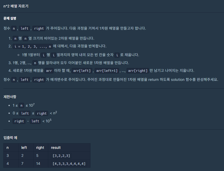 - n์ ๋ฒ์๊ฐ 100๋ง์ด๊ณ , left, right๋ n^2๊น์ง ์ฃผ์ด์ง๋ค๊ณ ํ๋ค.