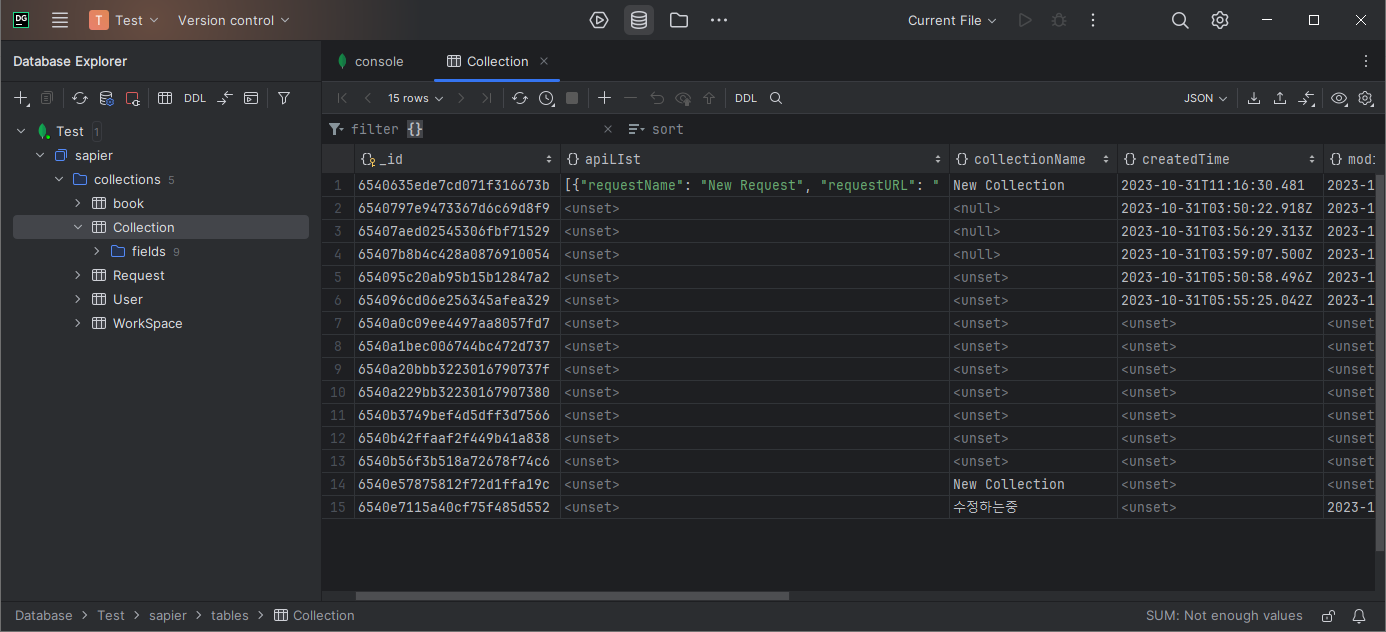 ์ปฌ๋ ์ ์ ํผ์น๋ฉด ํ์ ํด๋๋ก fields๊ฐ ์์ง๋ง, ๊ทธ๋ฅ ์์ฑ๋ค์ ๊ฐ๋จํ ๋ณด๊ณ ์ถ์๋ ์ฐ๊ณ , ๋ฐ์ดํฐ๋ ์ปฌ๋ ์ ์ ๋๋ธ ํด๋ฆญํ๋ฉด ๋ณผ ์ ์๋ค.