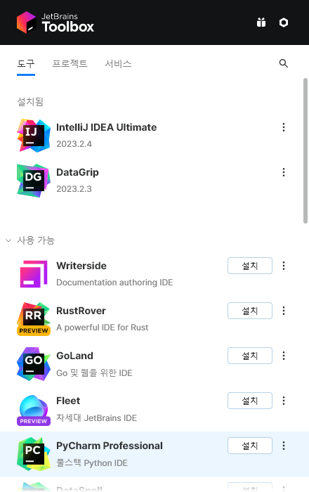 ๋ค์์ DataGrip์ ๋ฉ์ธํ์ด์ง์์ ๋ค์ด๋ฐ๊ฑฐ๋, JetBrains Toolbox๋ฅผ ์ด์ฉํด ๋ค์ด๋ฐ์ ์ ์๋ค.
