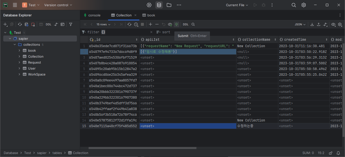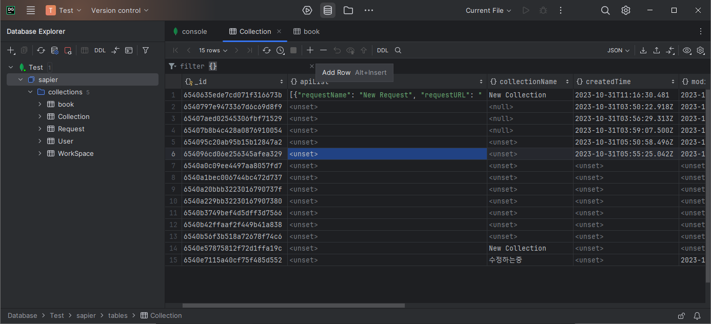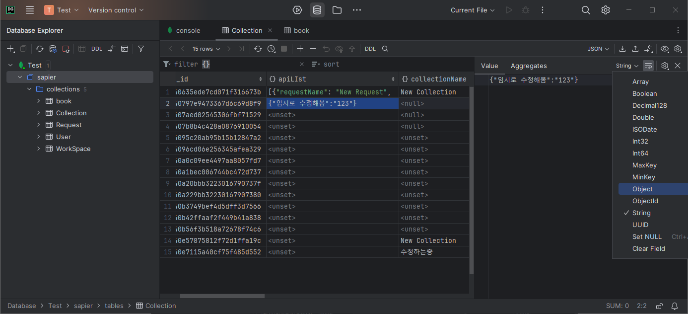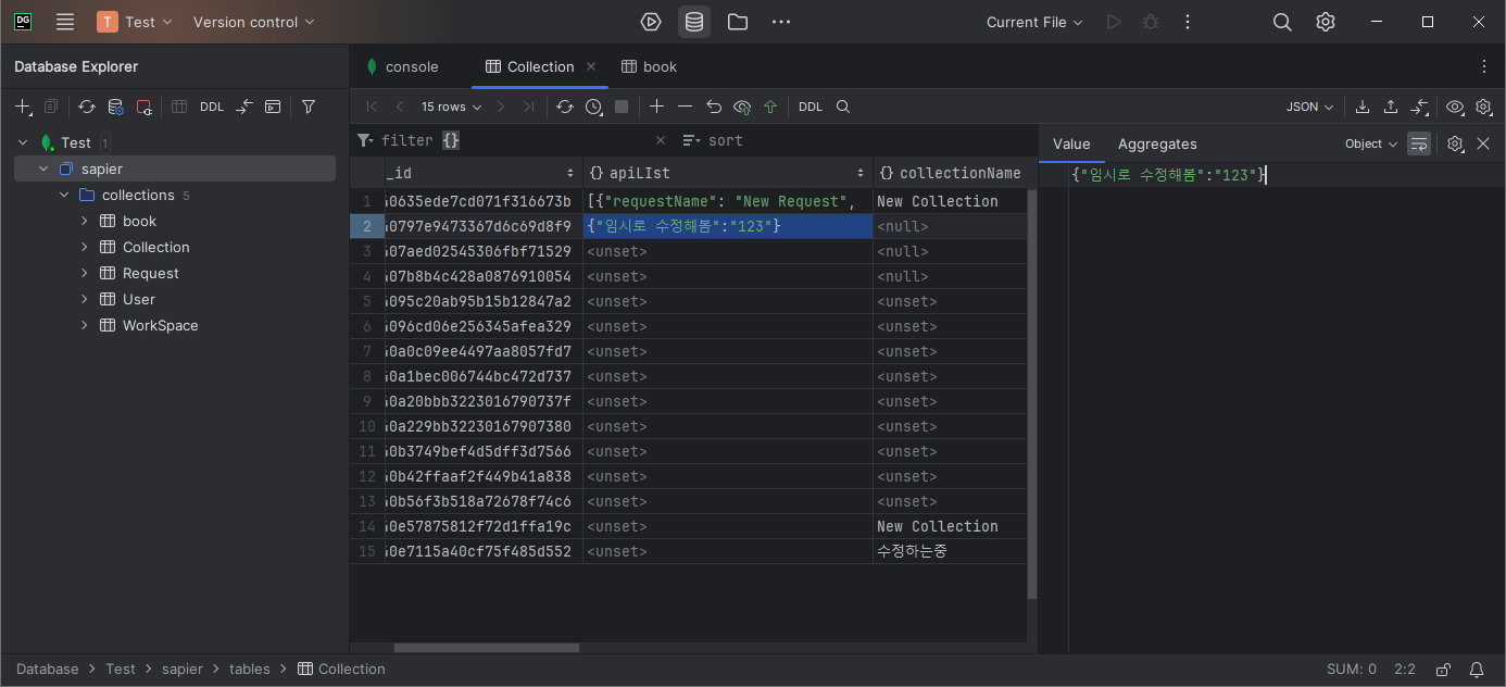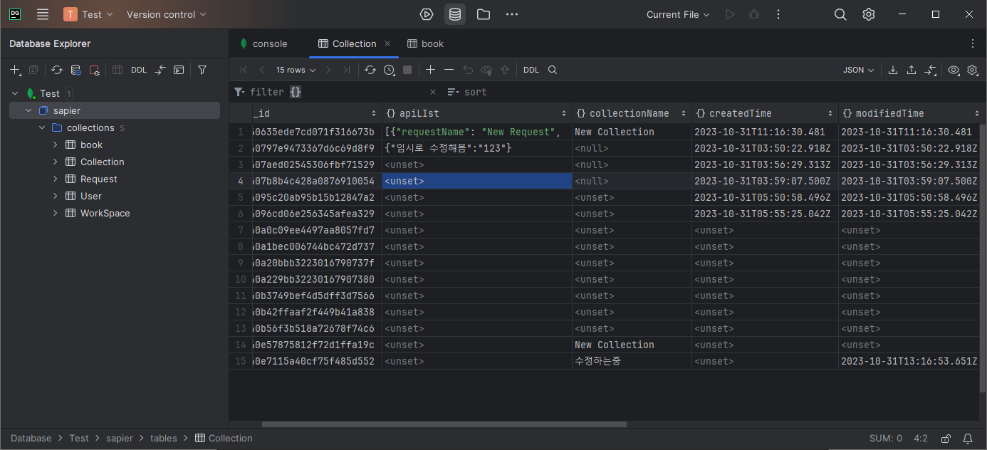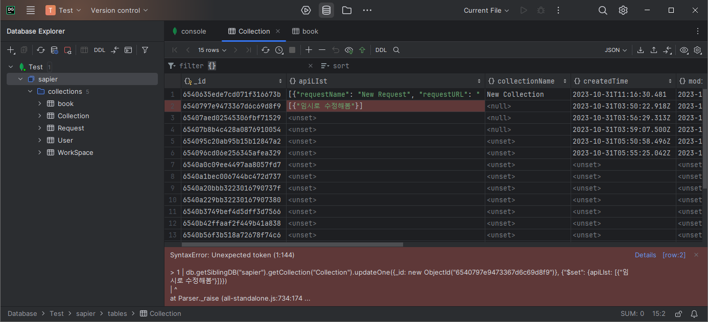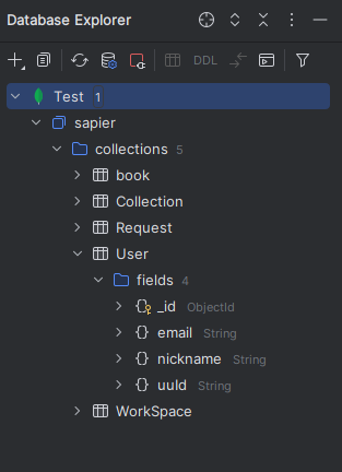 ํ์ฌ ์งํ์ค์ธ ํ๋ก์ ํธ์ MongoDB๋ฅผ ์ฐ๊ฒฐํด๋ดค๋๋ฐ, ๊ฐ๊ฐ ์ค๋ช ํ์๋ฉด sapier๊ฐ ํ๋ก์ ํธ์ MongoDB ์ด๋ฆ, collections์ ํ์ ์ปฌ๋ ์ ๋ค์ธ book, Colelction, Request, User, WorkSpace๊ฐ ๋ชจ์ฌ์๋ค.