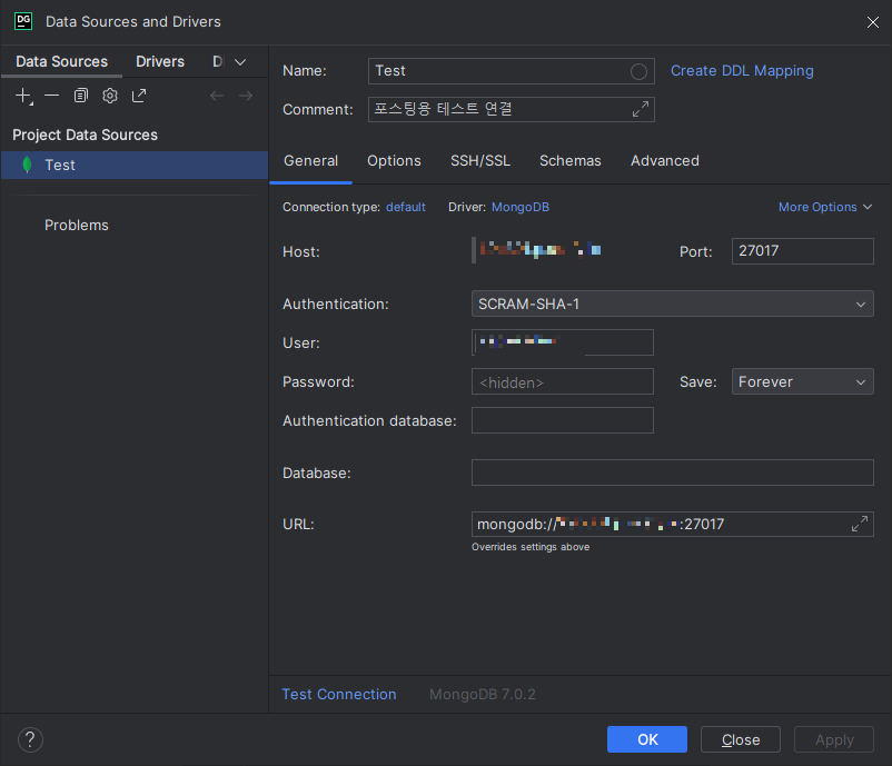 ์นธ๋ค์ด ๋ค ๋น์ด์๋๋ฐ, ์๋ DB๋ฅผ ์ธ๋ถ์์ ์ฐ๊ฒฐํ๋ ค๋ฉด ํ์ํ ๊ฒ๋ค์ด host, port, user, pw ๋ฅผ ๊ธฐ๋ณธ์ผ๋ก ์ํธํค ๋ฑ์ด ํ์ํ๋ค. Name์ด๋ Comment๋ DataGrip์์์ ๊ตฌ๋ถํ๋ ค๊ณ ์๋ ๊ฒ์ธ ๊ฒ ๊ฐ์ ๋ง์๋๋ก ์ด๋ฆ์ ์ง์๋ค.
