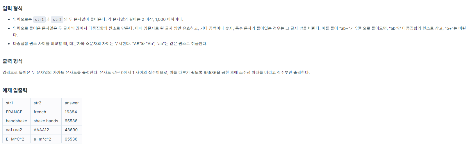 ์ด ๋ฌธ์ ๋ ์์นด๋ ์ ์ฌ๋๋ฅผ ์ค๋ช ํด์ฃผ๊ณ ์์นด๋ ์ ์ฌ๋๋ฅผ ์ง์ ๊ณ์ฐํ๋ ํ๋ก๊ทธ๋จ์ ์์ฑํ๋ ๋ฌธ์ ์ ๋๋ค. ์์นด๋ ์ ์ฌ๋๋ ์ค๋ฌด์์๋ ์ ์ฌํ ๋ฌธ์๋ฅผ ํ๋ณํ ๋ ์ฃผ๋ก ์ฐ์ด๋๋ฐ์, ๋ชฐ๋๋๋ผ๋ ๋ฌธ์ ์์ ์์ธํ ์ค๋ช ํด์ฃผ๊ธฐ ๋๋ฌธ์ ์ดํดํ๋๋ฐ ์ด๋ ค์์ ์์์ ๊ฑฐ ๊ฐ์ต๋๋ค. ๊ณต์์ ๋งค์ฐ ๊ฐ๋จํ๋ฐ์, ๊ต์งํฉ์ ํฉ์งํฉ์ผ๋ก ๋๋ ์์ ๋๋ค. ๋ค๋ง, ์ด ๊ฐ์ 0์์ 1 ์ฌ์ด์ ์ค์๊ฐ ๋๋๋ฐ, ์ฌ๊ธฐ์๋ ์ด๋ฅผ ๋ค๋ฃจ๊ธฐ ์ฝ๋๋ก 65536์ ๊ณฑํ ํ ์์์ ์๋๋ฅผ ๋ฒ๋ฆฌ๊ณ ์ ์๋ถ๋ง ์ทจํ๋๋ก ํฉ๋๋ค.