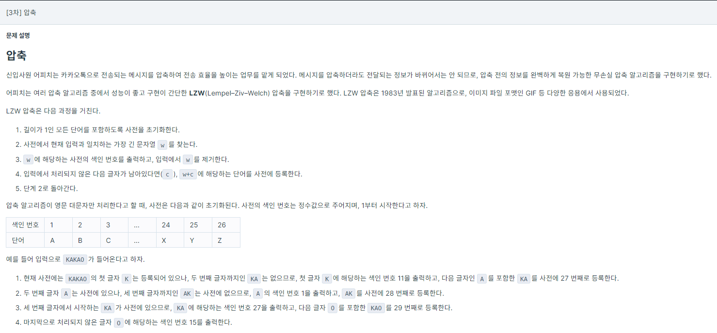 - LZW๋ผ๋ ์์ถ ์๊ณ ๋ฆฌ์ฆ์ ๊ตฌํํ๋ ๋ฌธ์ ์ฌ์, ๋ฌธ์ ์ค๋ช