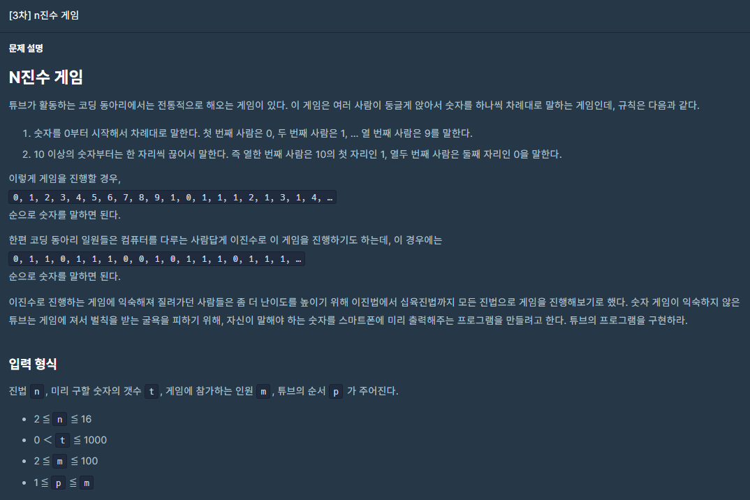 - ์ ์๋ฅผ 0๋ถํฐ ์ ์ ๋๋ ค๊ฐ๋ฉฐ, ์ฃผ์ด์ง ์ง๋ฒ์ผ๋ก ๋ณํํ ์ซ์๋ฅผ ํ ๋ฌธ์์ฉ ์ฐธ๊ฐ ์ธ์๋ค์ด ๋งํ๋ค.