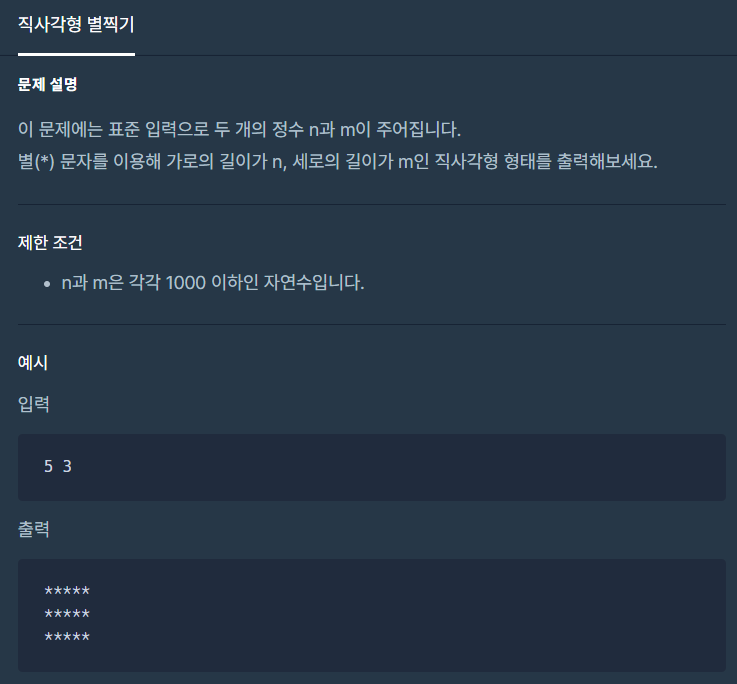 - n, m ๋ ๋ณ์ ์ ๋ ฅ์ ๋ฐ๊ณ , ์ด์ค ๋ฐ๋ณต๋ฌธ์ ๋๋ ค ' * '๋ฅผ ์ถ๋ ฅํ๋ค.