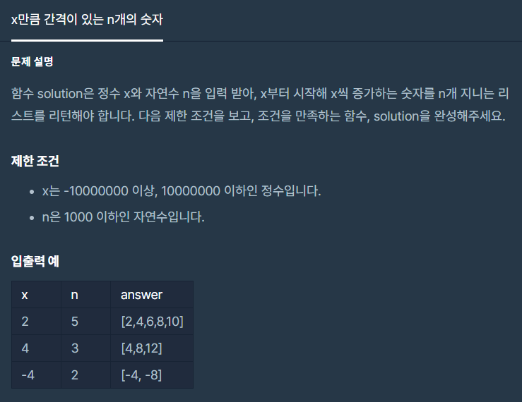 - ์ฃผ์ด์ง ์ด๊ธฐ๊ฐ x๋ถํฐ, n๋ฒ ์ฒ์ x๊น์ ๋ํด๊ฐ๋ฉฐ ๋ฆฌ์คํธ์ ๋ฃ๊ณ ๋ฐํํ๋ค.