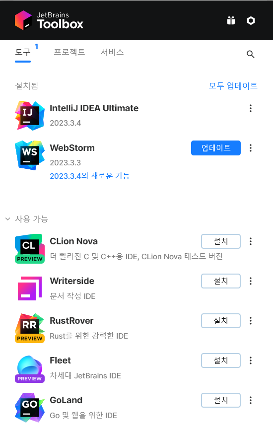 - JetBrains Toolbox를 먼저 설치하면, 설치와 버전 관리가 더 쉬운 것 같다.