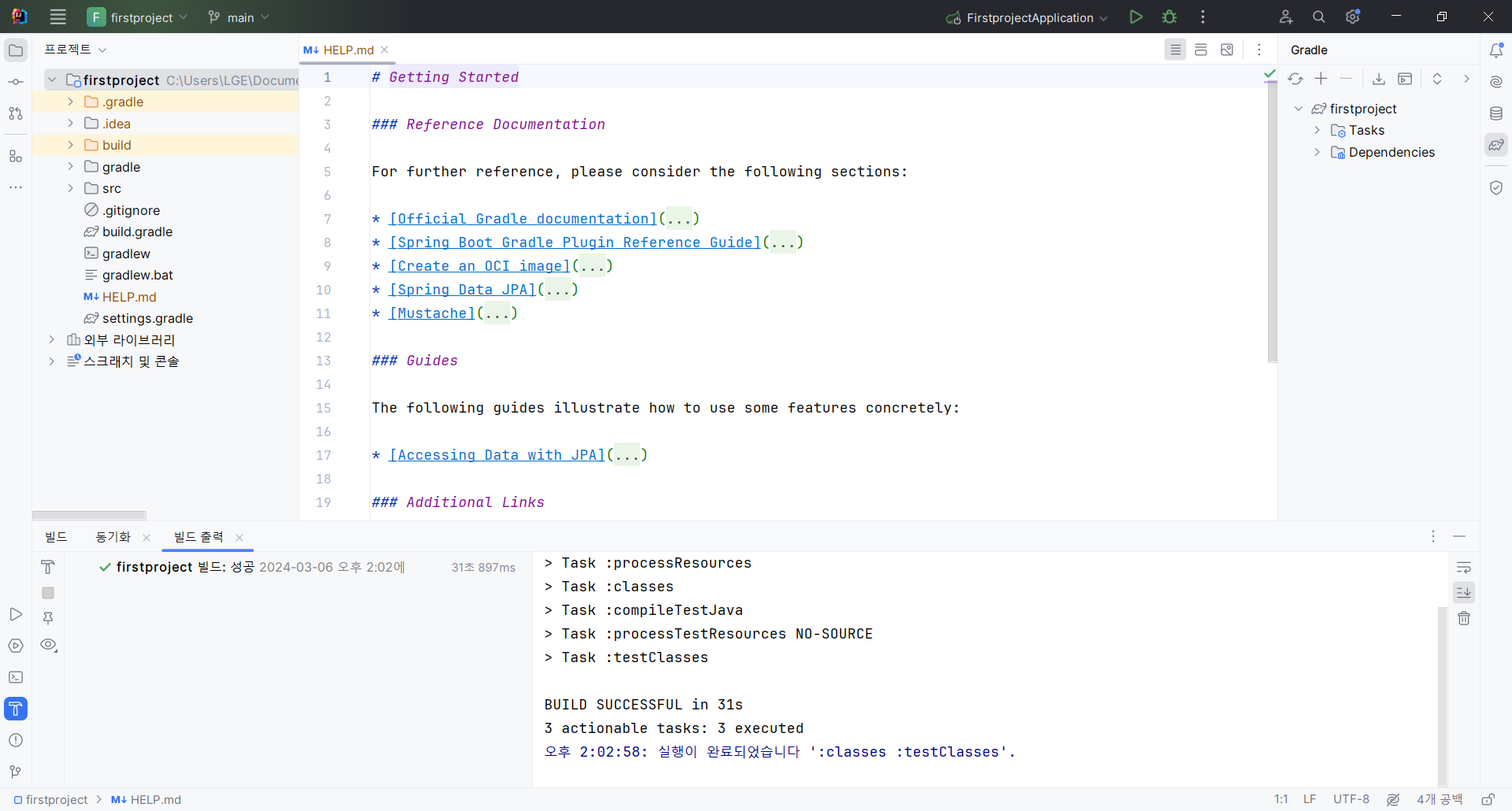 - 'public class FirstprojectApplication {' 왼쪽 실행 버튼