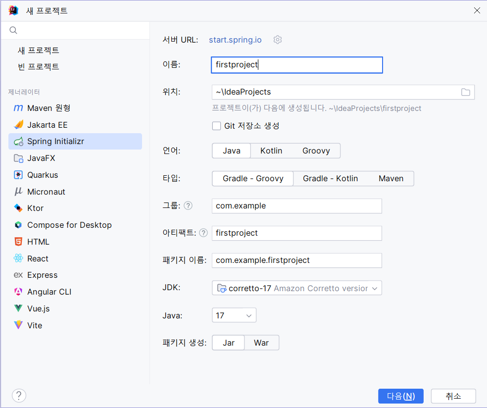 - 난 IntelliJ 새 프로젝트 제네레이터에 있는 Spring Initializer 사용했다.
