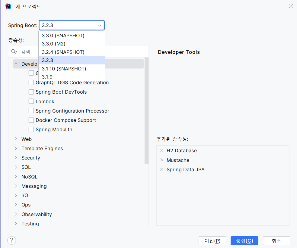 - 종속성(Dependencies)으로 H2 Database, Mustache, Spring Data JPA 추가