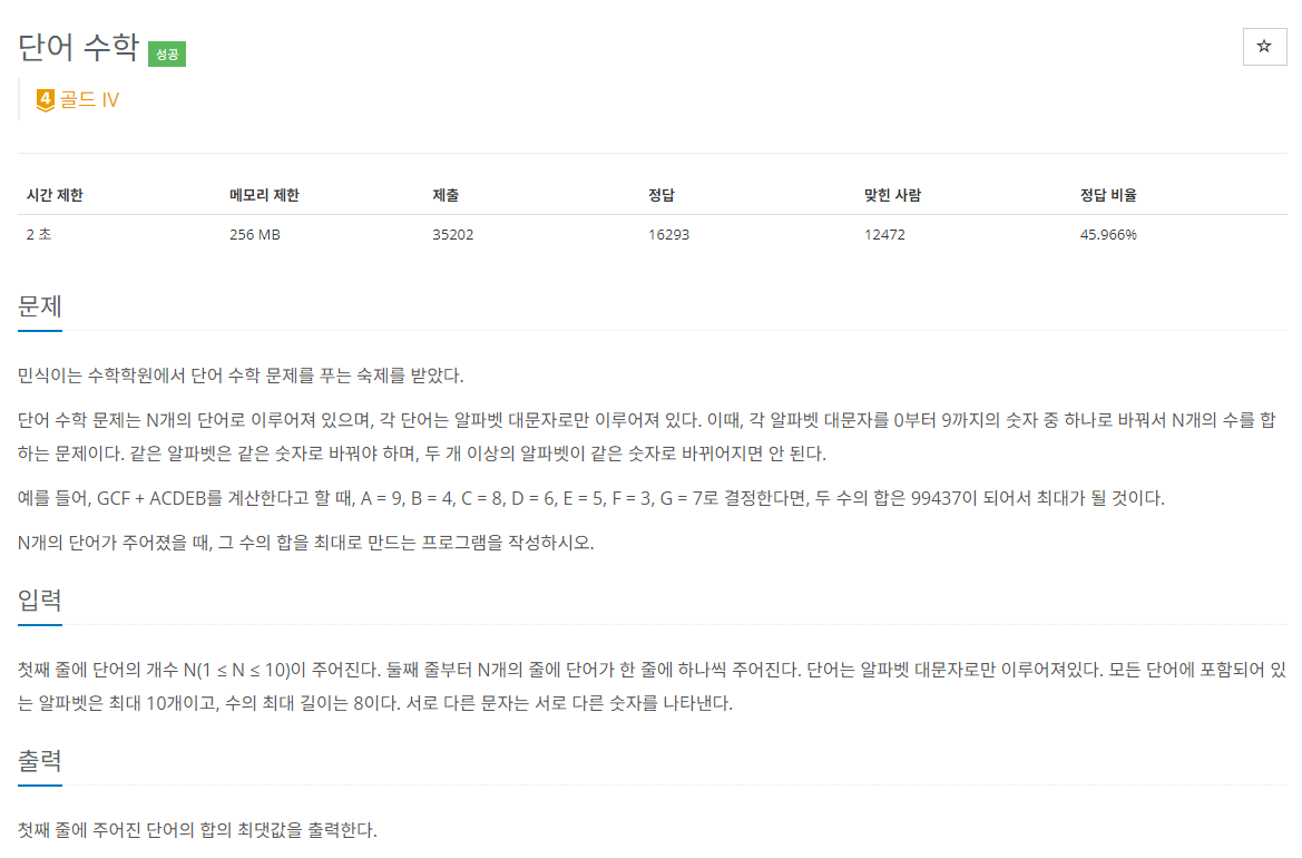 BOJ_1339 : ๋จ์ด ์ํ ๋ณธ๋ฌธ