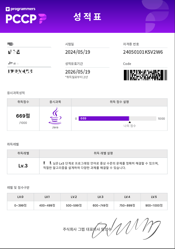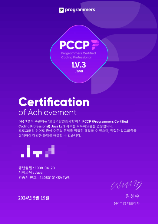 프로그래머스에서 주관하는 자격증 중 하나인 PCCP의 Lv3 를 취득했다🎉🎉