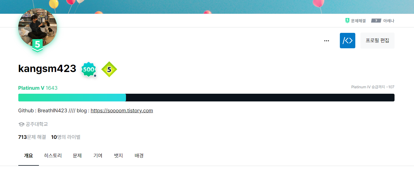 백준 플레5를 최근에 달성했고, 스트릭을 골드 4 문제를 풀면서 유지했다.