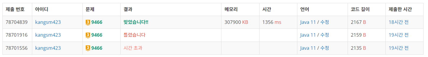 - 2๋ฒ์งธ ์ ์ถ์ ํ๋ ธ์ต๋๋ค๋ ์ด์ ํ์์์ ํ์ด ์์์ ์์๋๋ฐ, ํ์ฌ ํ์์์ ๋ค์ ๋ฐฉ๋ฌธํด์ผ ํ ๊ฒฝ์ฐ์ ์ค๋ฅ๊ฐ ๋์ ํ๋ ธ๋ค. visited๋ฅผ ์ฒ์์ boolean ๋ฐฐ์ด๋ก ๋๋ค๊ฐ, ์ด ๋ฌธ์ ๋ฅผ ํด๊ฒฐํ๊ธฐ ์ํด start๋ฅผ ๊ธฐ๋กํ๊ณ visited๋ฅผ int๋ฐฐ์ด๋ก ๋ฐ๊ฟ์ ์ฒ๋ฆฌํ๋ค.