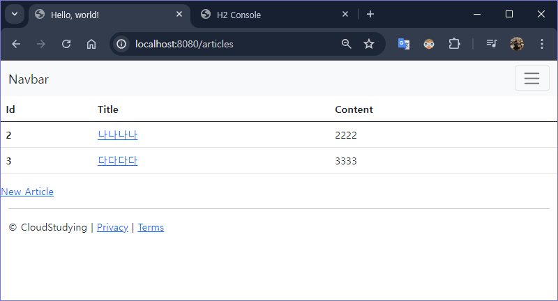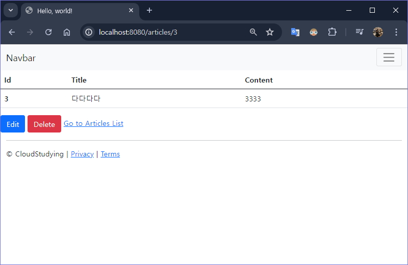 Article target = articleRepository.findBiyId(id).orElse(null); if(target != null) { articleRepository.delete(target); }- null 체크를 하는 이유는 우리가 원하는 행동이 정확한 ‘삭제’이기 때문